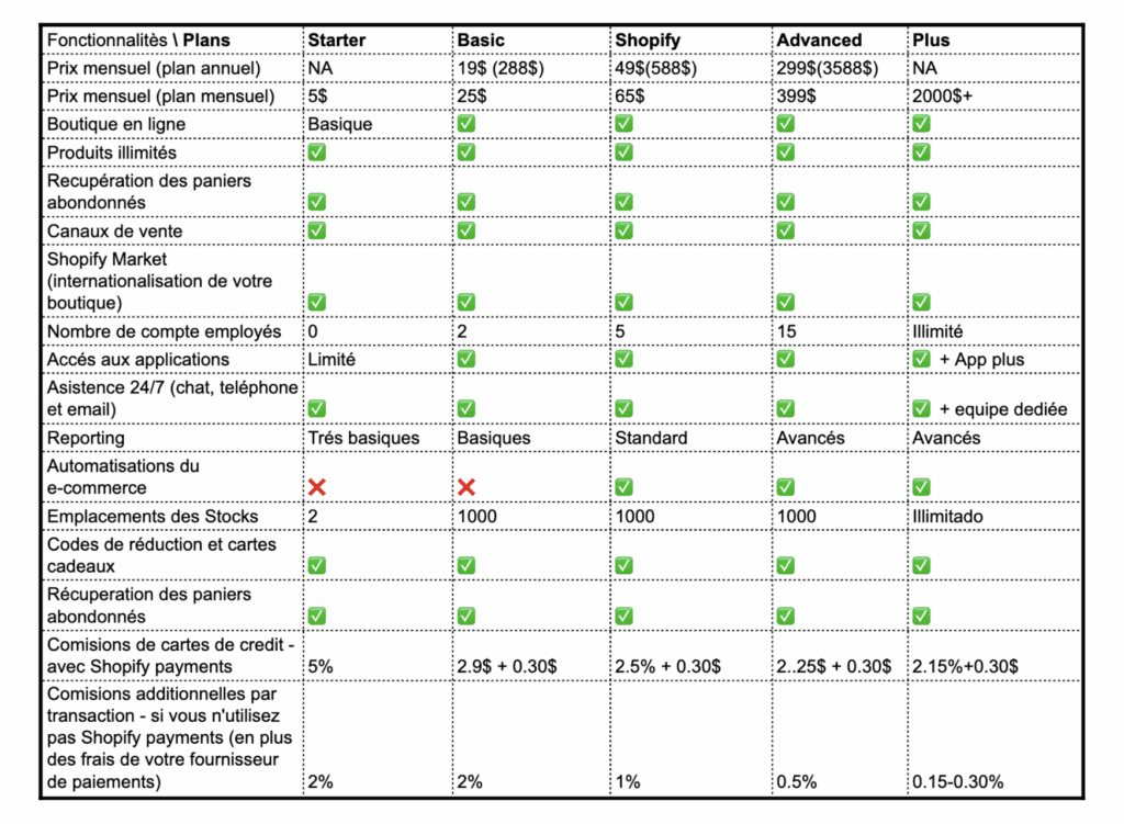 *Avant de commencer, il est important de noter que les prix présentés dans cet article proviennent de Shopify et peuvent varier en fonction des pays. Consultez le tarif pour votre pays ici.