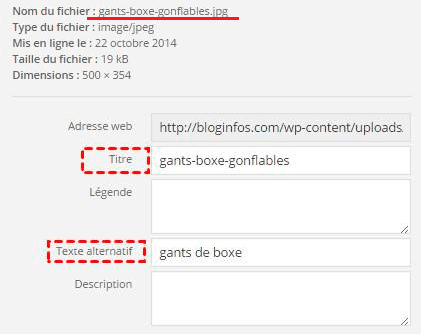 - Renseignez la balise <Titre> en décrivant brièvement votre image avec des mots clés.