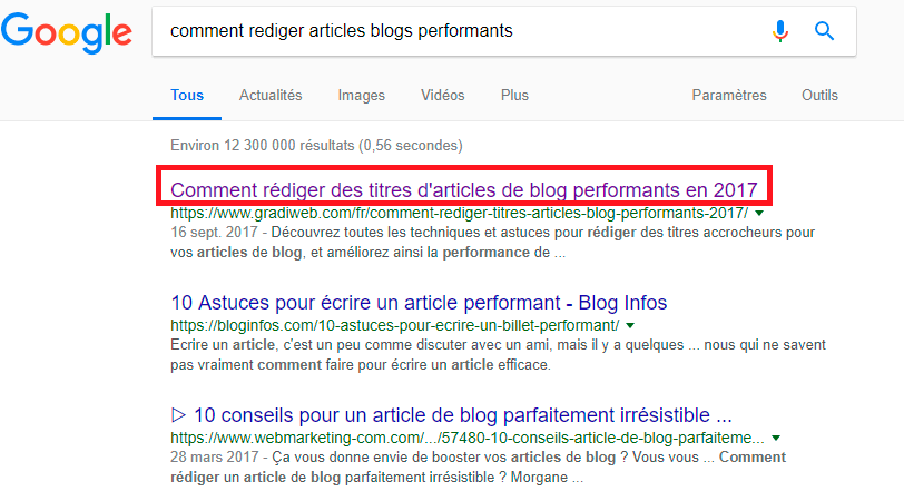 Le titre est d’autant plus important que c’est la première chose que voient les internautes lors d’une recherche sur Google. À vous donc de proposer le titre le plus accrocheur possible pour que votre article soit choisi en priorité.