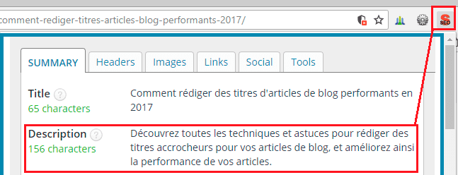 Si vous souhaitez détecter facilement la “META Description” de vos pages ou celles de vos concurrents, vous pouvez installer cette extension sur Chrome. SEO META IN 1 CLICK