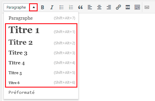 Si vous utilisez un CMS WordPress, et que vous n’avez pas un bon niveau technique, pas de panique. Dans l’éditeur de texte, lors de la création de l’article, Titre 1 correspond à une balise <h1>, Titre 2 à une balise <h2>, etc.